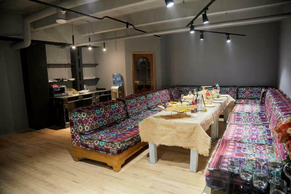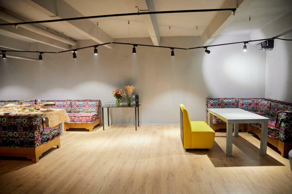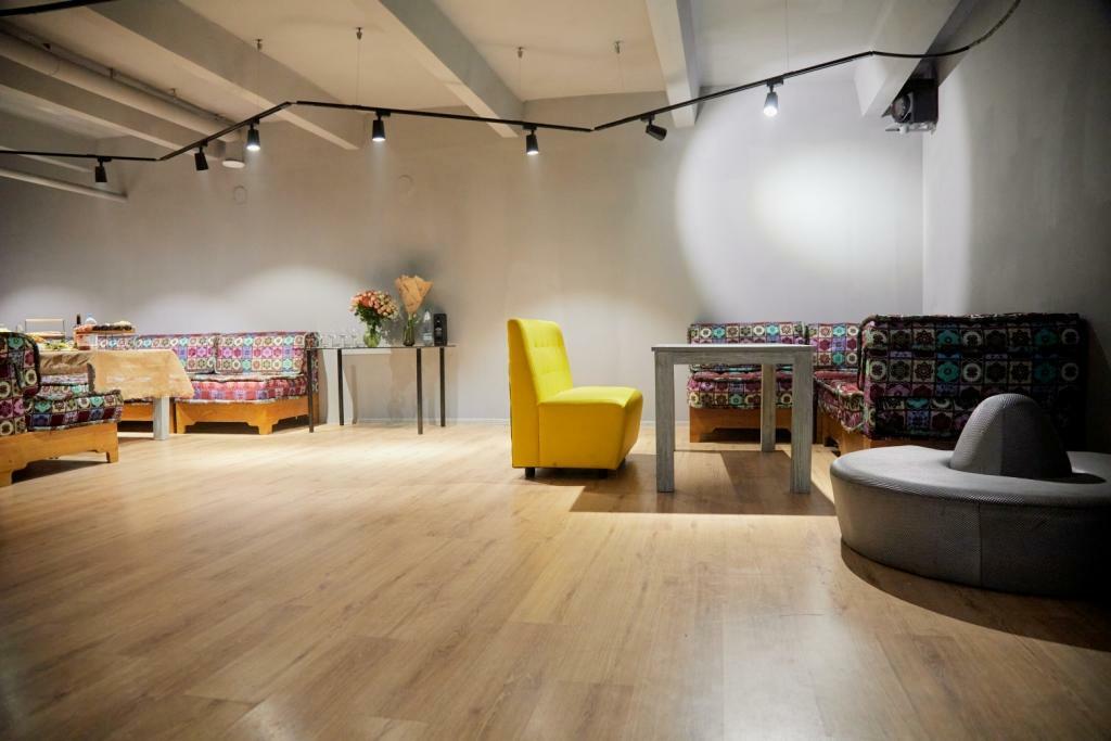 В лофте имеется профессиональная аудиосистема, проектор. Также помещение оснажено необходимым комплектом мебели, посудой и прочими аксессуарами.